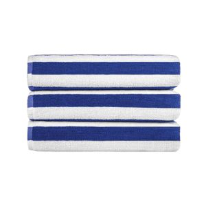 This 30" x 60" cabana pool towel is made from 100% cotton yarn and designed for commercial pool, hotel, and resort use. It features a blue cabana stripe design, a 9.00 lb per dozen weight, and VAT-dyed stripes for better colorfastness against washing, chlorine, and sunlight. The towel is also machine washable and manufactured for durability and repeated laundering.